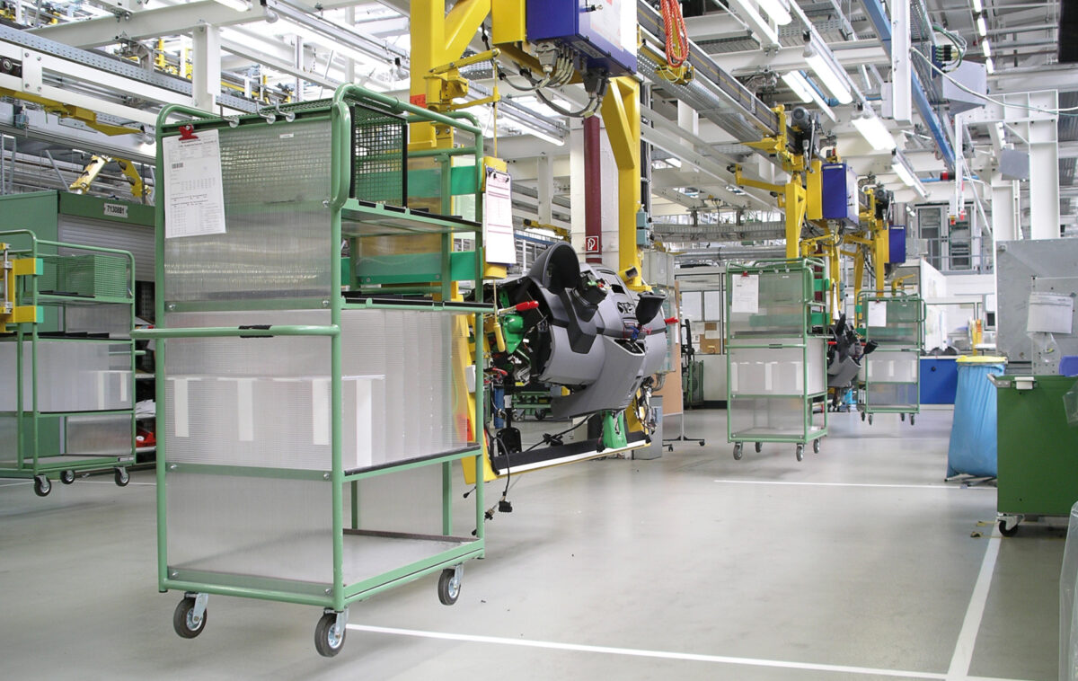Der Kommissionierwagen verfügt über fest definierte Andockpunkte, die eine einfache und sichere Verbindung zur Elektro-Hängebahn ermöglichen. Diese durchdachte Auslegung sorgt für einen reibungslosen Übergang zwischen manuellem Transport und automatisiertem Materialfluss, wodurch der Montageprozess effizienter gestaltet wird.